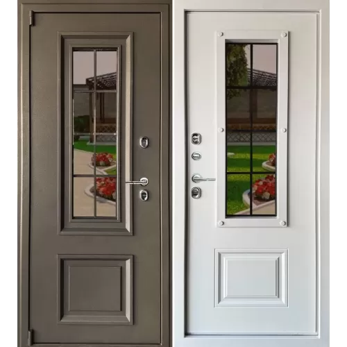 | Внешняя отделка | Металл, цвет "коричневый муар", матовый стеклопакет, внутренняя ковка. |