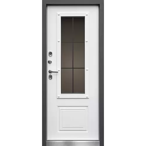 Отделка: «МУАР AKZO NOBEL RAL 7024» + грунт-барьер «AKZO NOBEL», 2-камерный стеклопакет, тонировка Бронза + ковка Британия / 16 мм МДФ панель, Белый матовый