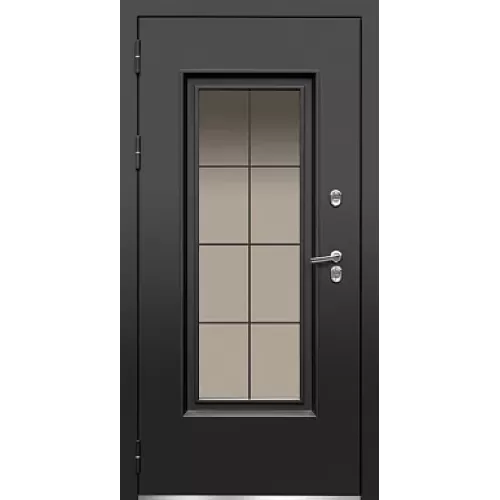 Отделка: «МУАР AKZO NOBEL RAL 9005» + грунт-барьер «AKZO NOBEL», 2-камерный стеклопакет, тонировка Бронза + ковка Британия / 16 мм МДФ панель, Белый матовый
