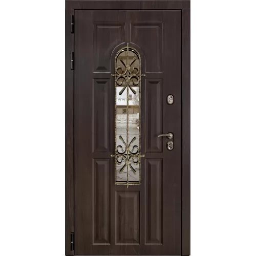 | Внешняя отделка | Панель МДФ Vinorit 10 мм + стеклопакет и ковка, цвет «Темный орех» |