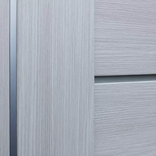 Экошпонированная сборная панель МДФ 16 мм. Горизонтальные вставки из светлого матового стекла. Вертикальная вставка из молдинга в цвете "хром". Доступные цвета: «белая лиственница».