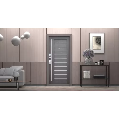 "Дуэт" - металлическая дверь со стильным дизайном и солидными характеристиками безопасности. Особого внимания заслуживает внутренняя отделка модели, представляющая собой сборную декоративную панель со вставками из матового стекла White Perl. Модель будет отлично сочетаться по стилю с дизайном межкомнатных дверей в квартире.
