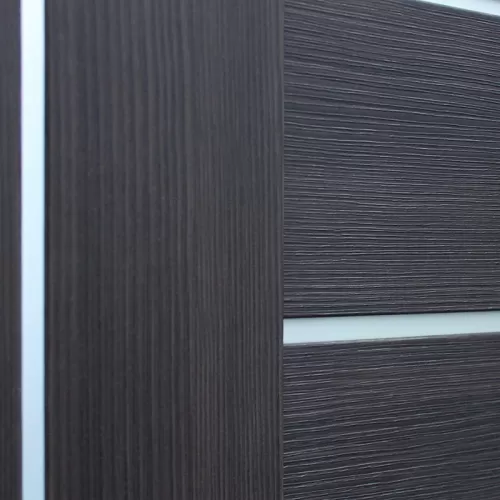 Экошпонированная сборная панель МДФ 16 мм. Горизонтальные вставки из светлого матового стекла. Вертикальная вставка из молдинга в цвете "хром". Доступные цвета: «орех рифленый».