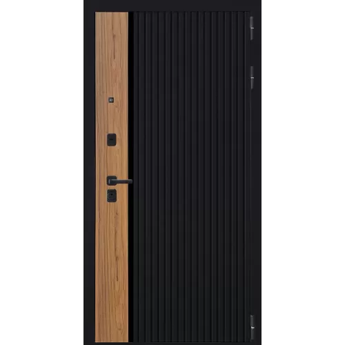 Отделка: 10 мм фрезерованная панель МДФ, Черная шагрень, вставка Орех каньон коньяк, окраска Муар черный / 10 мм фрезерованная панель МДФ,