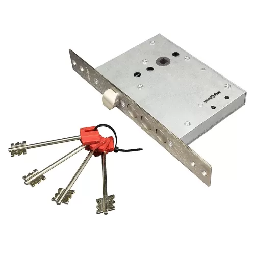 Замок врезной 6-сувальдный с защелкой. Замок универсальный, его можно устанавливать как в правые, так и в левые двери, переустановив защелку. Замок имеет защиту от высверливания, изготовлен из высокопрочных материалов, имеет защитное покрытие.